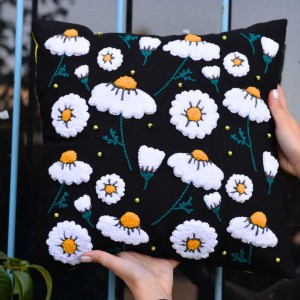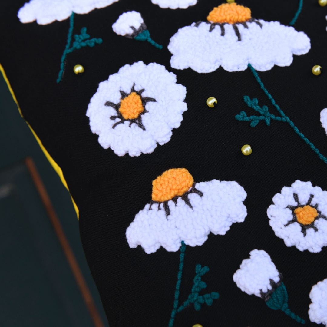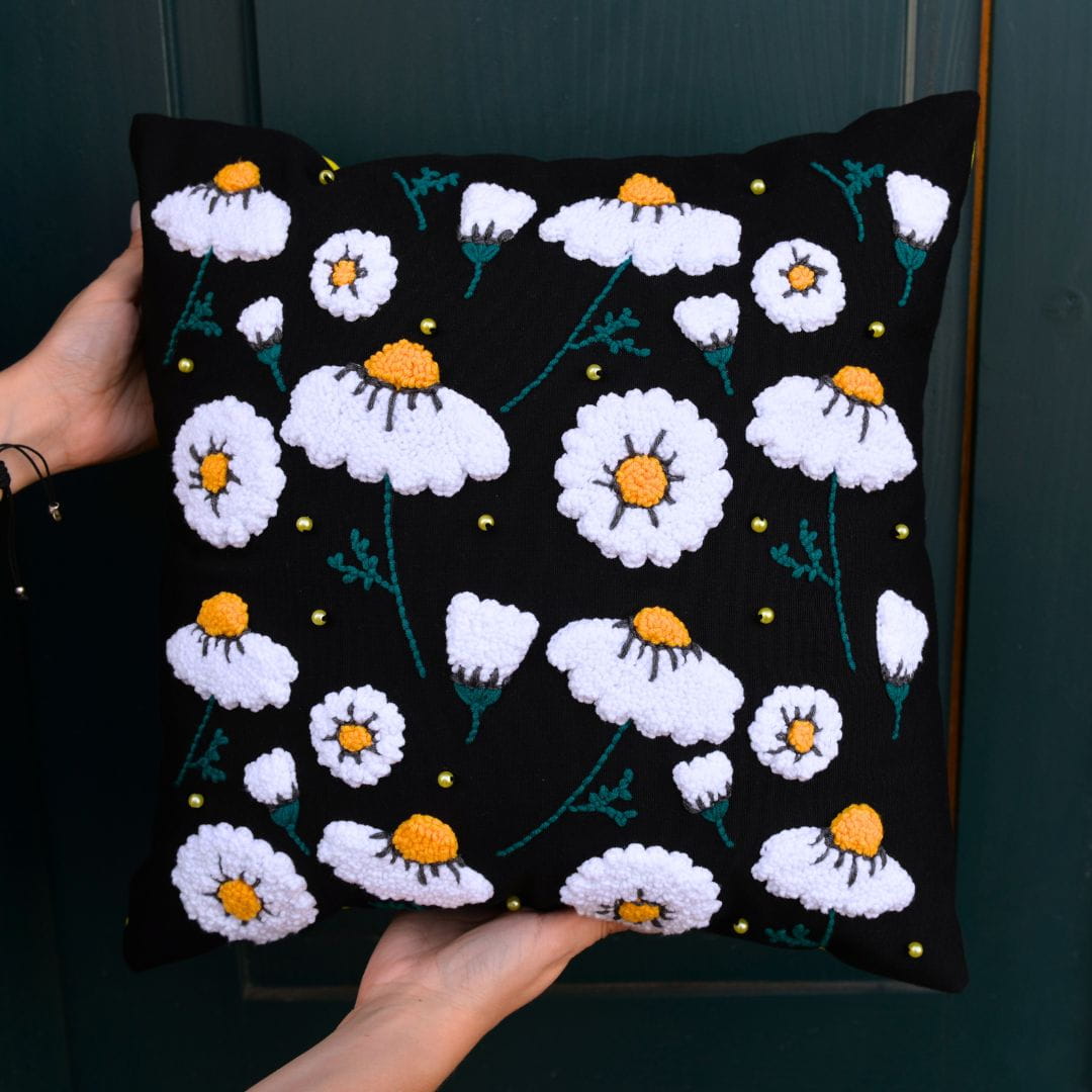 Poduszka z haftem stokrotek jako subtelny kwiatowy akcent. Haft wykonany metodą punch needle.