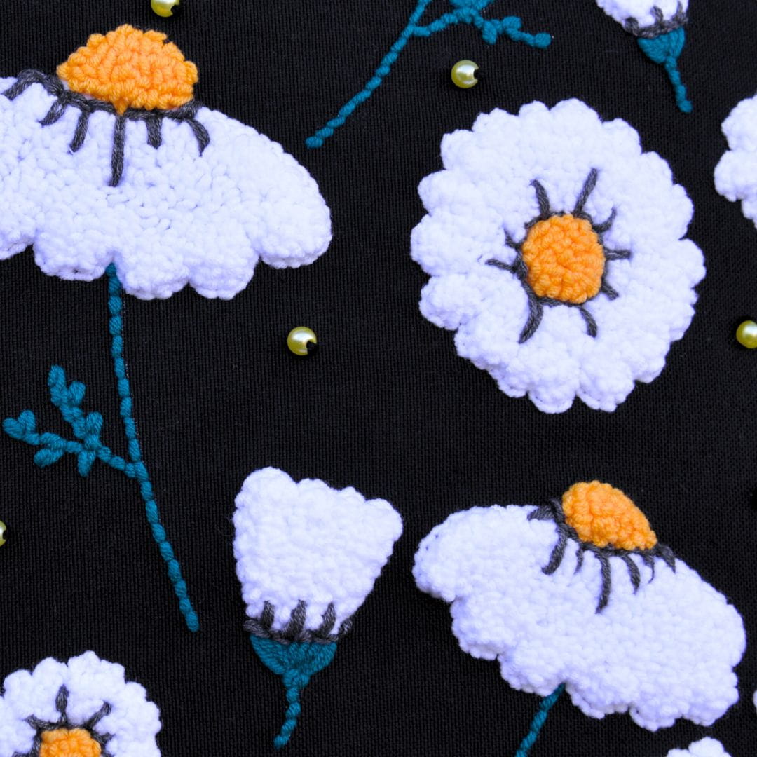 Poduszka „Stokrotkowa mgiełka” to propozycja pełna delikatności i lekkości. Wyhaftowane białe stokrotki na czarnym tle tworzą piękny kontrast do ciemnych mebli i tkanin, wprowadzając do wnętrza romantyczny klimat oraz oryginalny, przyciągający wzrok akcent.