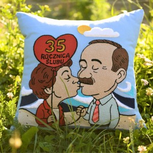 Poduszka dekoracyjna, która opowiada historię wspólnych lat w kreatywny i pełen ciepła sposób, to moja kolejna propozycja na zamówienie. Haft wykonałam na podstawie zdjęć, przedstawiając małżonków w zabawnej, bajkowej odsłonie na wakacyjnym tle. Ta oryginalna pamiątka to prezent na długie lata – produkt z duszą, który wniesie ciepło i przypomni wyjątkowe chwile.